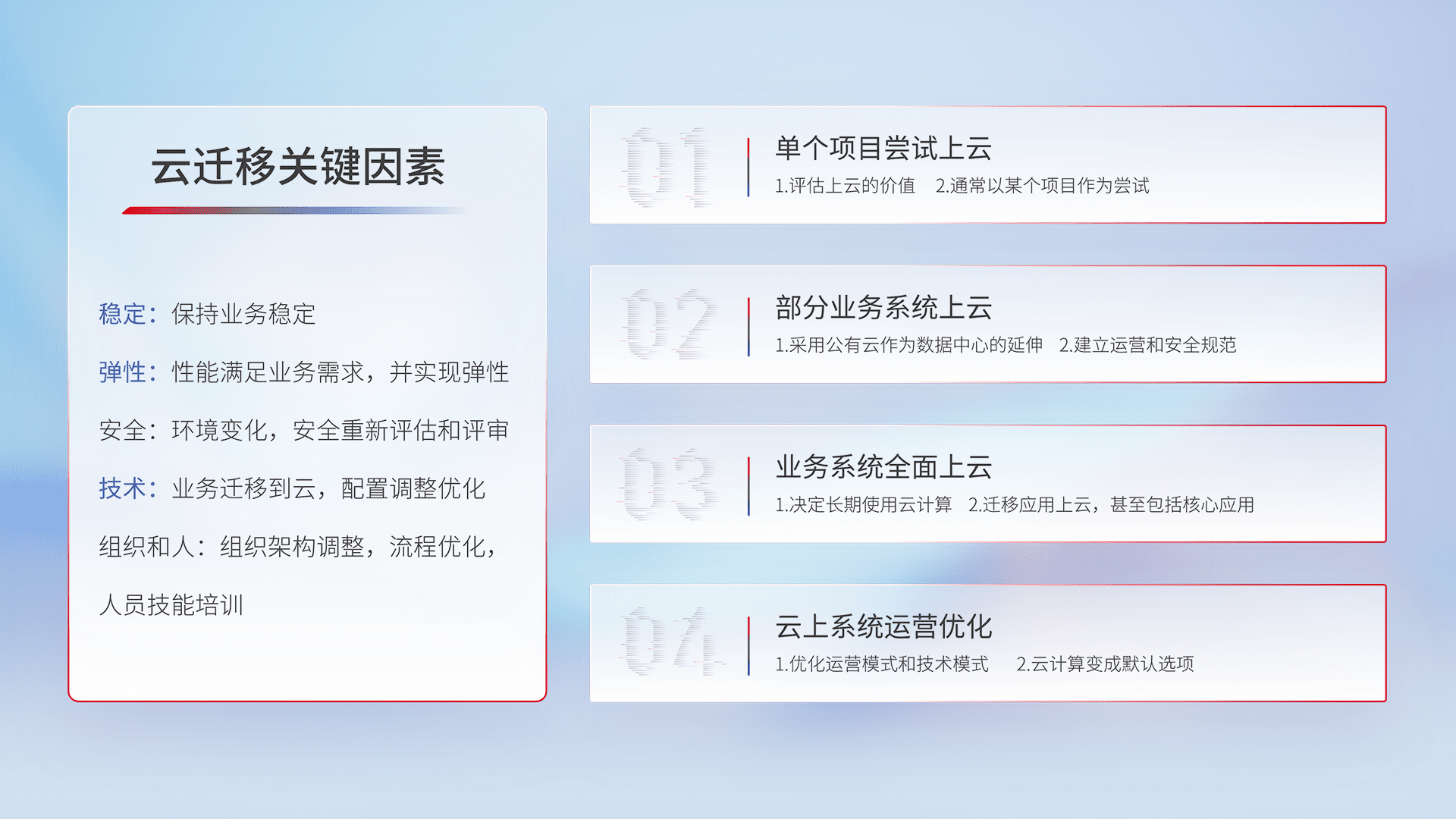 结合实际业务,,,从规划设计、、、、云平台选型、、、云原生改造、、数据迁移、、集成交付,,迁移全过程为客户识别最佳上云路径,,做好风险识别管理,,设计网络架构、、身份权限、、、安全审计合规、、操作审计、、日志审计、、、、监控告警策略、、多站点容灾设计等,,,,对云上基础设施进行整体规划,,,提升IT治理水平,,,以满足弹性、、、、高可用、、高性能的需求。。。