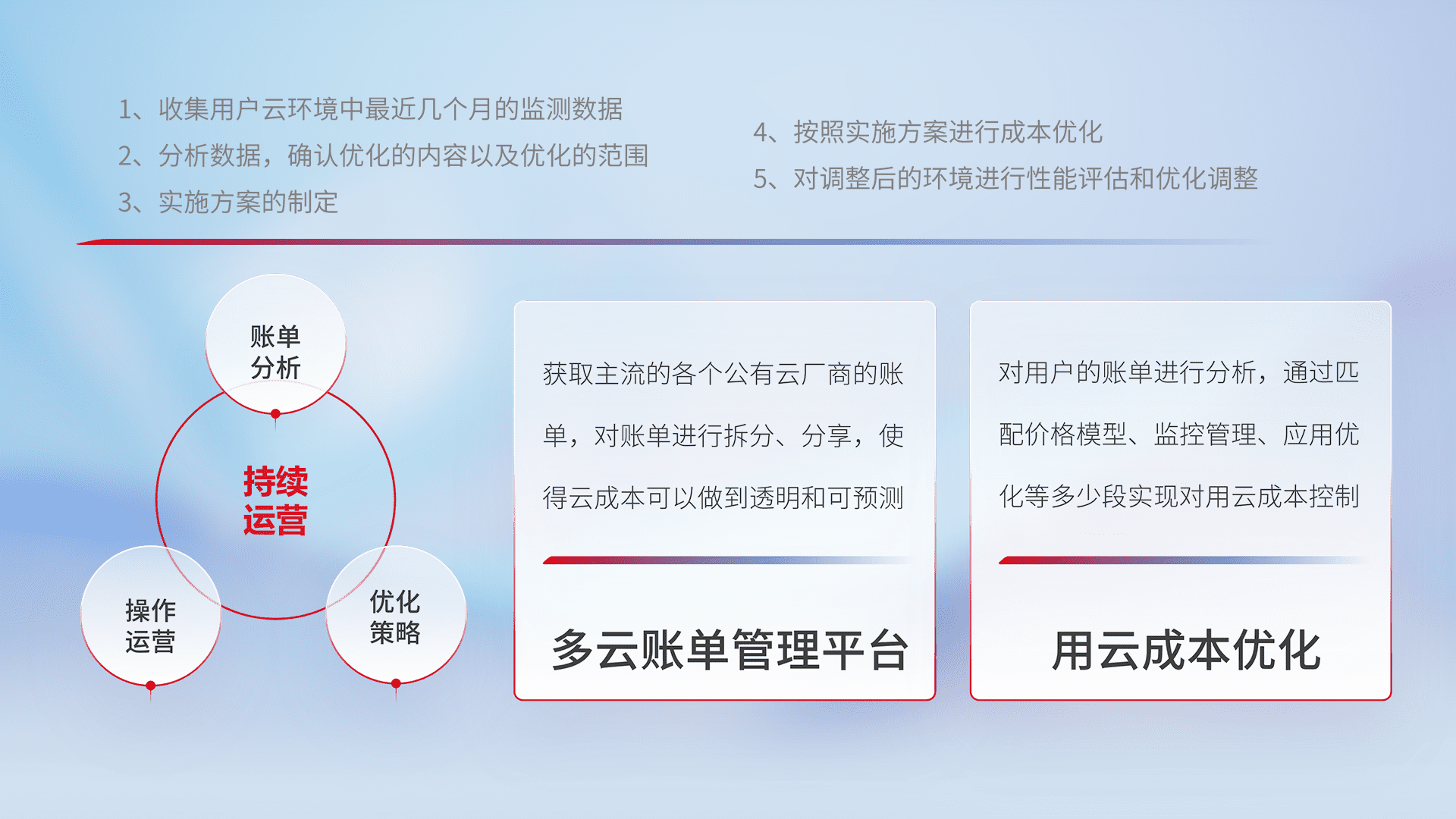 通过多云纳管,,以统一的资源数据模型把客户的云资源进行抽象和封装,,,进而实现对多云资源的统一操作,,保障云资源管理的可靠性、、、稳定性与可用性。。。。量身定制化运维内容,,,配置、、、、开发运维、、补丁管理、、、备份、、、监控、、认证和访问管理、、、、审计和日常巡检等,,,保障在用云过程中的可靠度,,,,稳定度以及高可用率。。。。